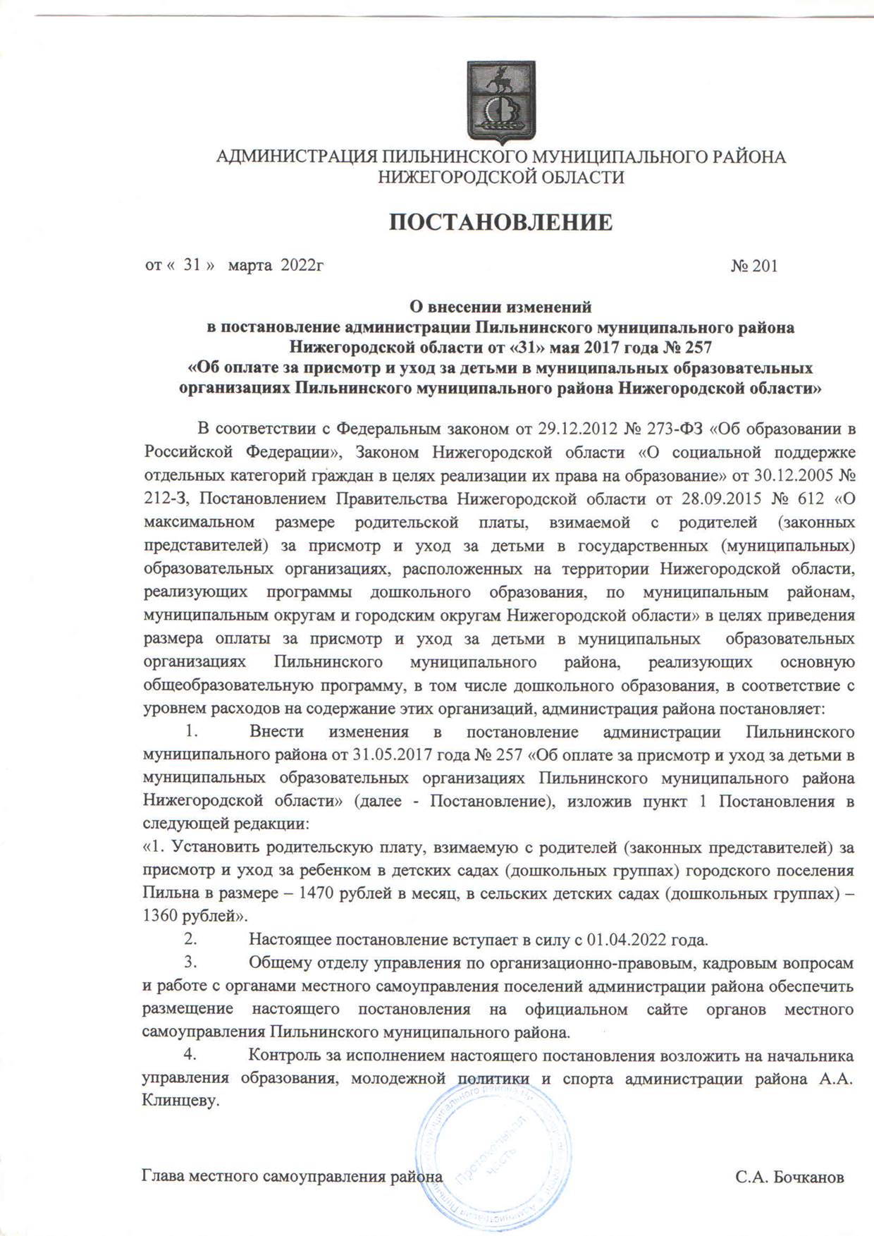 О внесении изменений в постановление администрации района от 31.05.17г. об оплате за присмотр и уход за детьми в муниципаных образовательных организациях Пильнинского муниципального района Документ подписан электронной подписью Серийный номер 603332450510203670830559428146817986133868575800 Директор/Заведующий Аймалетдинова Альфия Абдулбяровна Дата подписания документа 04.03.2021 17:10:40 (скачать) (посмотреть)